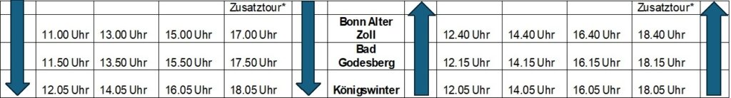 Merke! – Beginnen Sie die Tour ab Königswinter, ist selbstverständlich bei der Abfahrt 16.05 Uhr bzw. 18.05 Uhr (an ausgewählten Samstagen in den Sommermonaten) keine Rückfahrt von Bonn zurück nach Königswinter möglich, da es sich dann um die jeweils letzte Fahrt von Königswinter handelt!